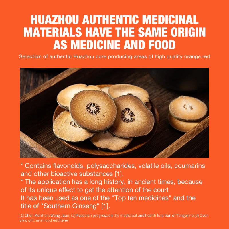 "From the ancient method of preparation in the Ming and Qing Dynasties to the modern non-heritage inheritance, the adherence to the twelve processes and the innovation of small molecule cold extraction, we use ingenuity to lock the essence of each piece of tangerine red. From a tribute to the imperial court to a health choice for all, from a single medicinal material to a new product of medicine and food homology, we take the industrial responsibility to let the millenium tangerine red enter the modern life and protect every breath and health. A piece of Juhong, thru thousands of years; a piece of ingenuity, linking the world. We are committed to making the health power of Huazhou Pomelo benefit every family in the world